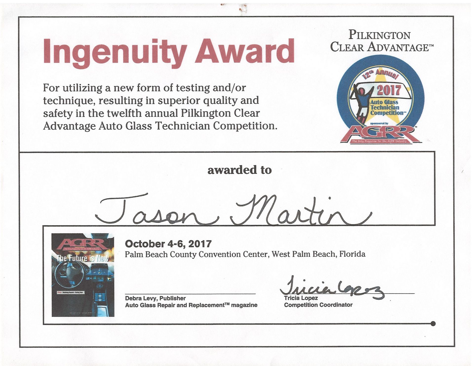 - 2018 GOLD MEDAL WINNER PILKINGTON ADVANTAGE 13TH ANNUAL AUTO GLASS TECHNICIAN OLYMPICS